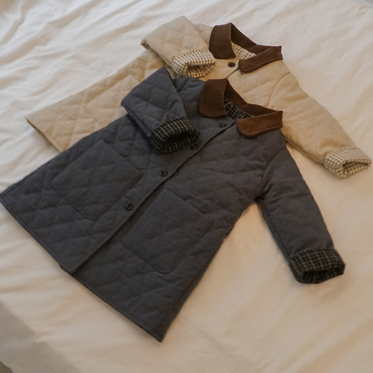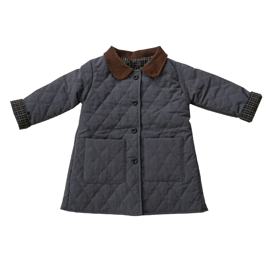 코듀로이 카라 배색과 안감의 체크 패턴이 더해져